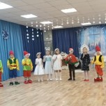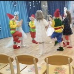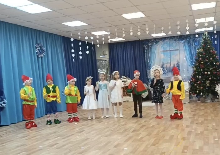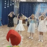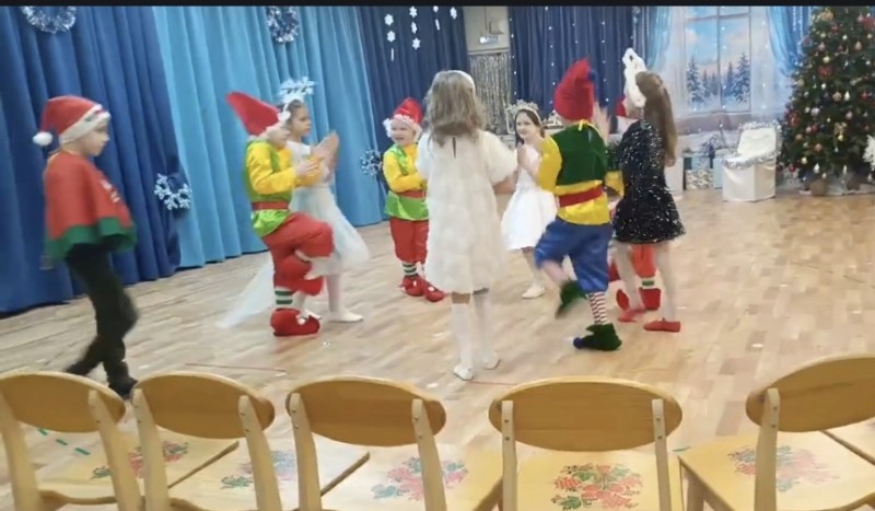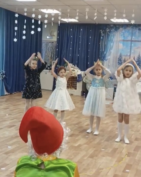 Костюмы девочек - снежинки + елочки.